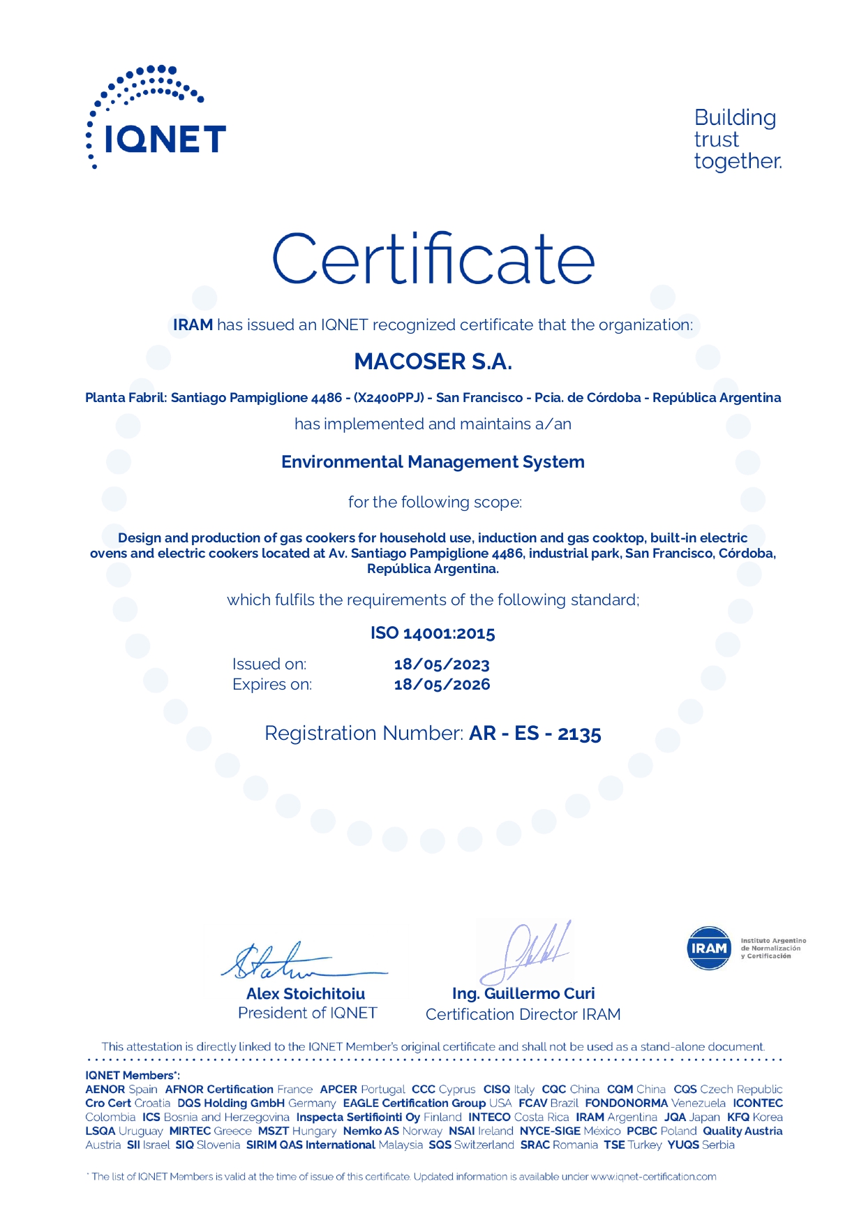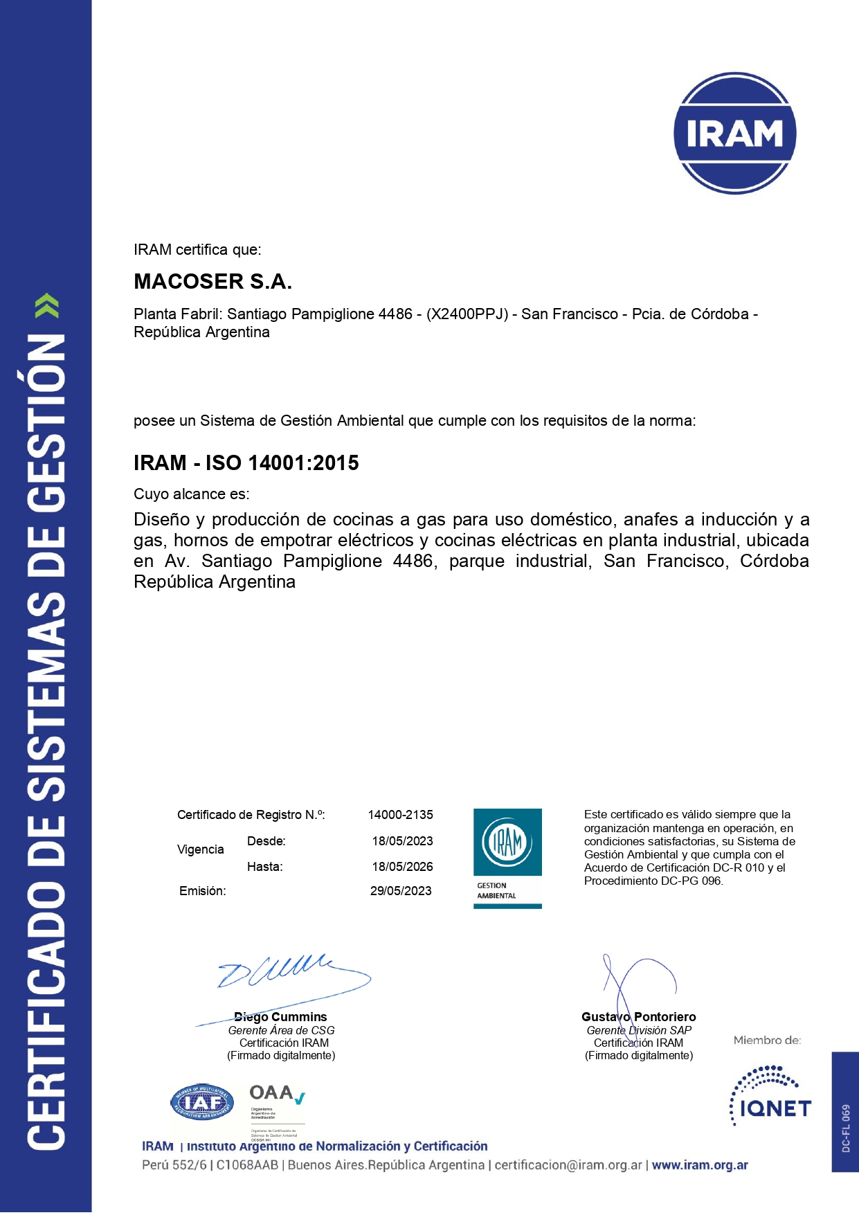Tenemos como objetivo la mejora continua para satisfacer la demanda de un mercado cada día más exigente. Este alto compromiso con la calidad asumido por nuestra Empresa y su personal, se vio reflejado en la permanente capacitación, logrando la certificación de su proceso de diseño, producción y comercialización de cocinas a gas, anafes a gas, anafes eléctricos a inducción magnética y hornos de empotrar eléctricos bajo las normas ISO 9001:2015 otorgada por IRAM Argentina.