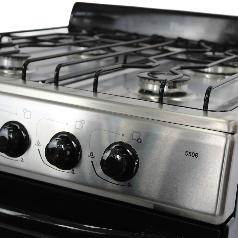 Cocina a gas 5508 es una cocina a gas de diseño compacto y elegante, ideal para cocinas pequeñas. Diseñada con foco en la eficiencia y la practicidad del uso diario. Su terminación en acero inoxidable le otorga un estilo moderno y mayor resistencia al uso diario. Las rejillas de alambre enlozado aseguran estabilidad y durabilidad, mientras que la puerta del horno con doble cristal mejora la aislación térmica y permite controlar la cocción sin necesidad de abrirla.
